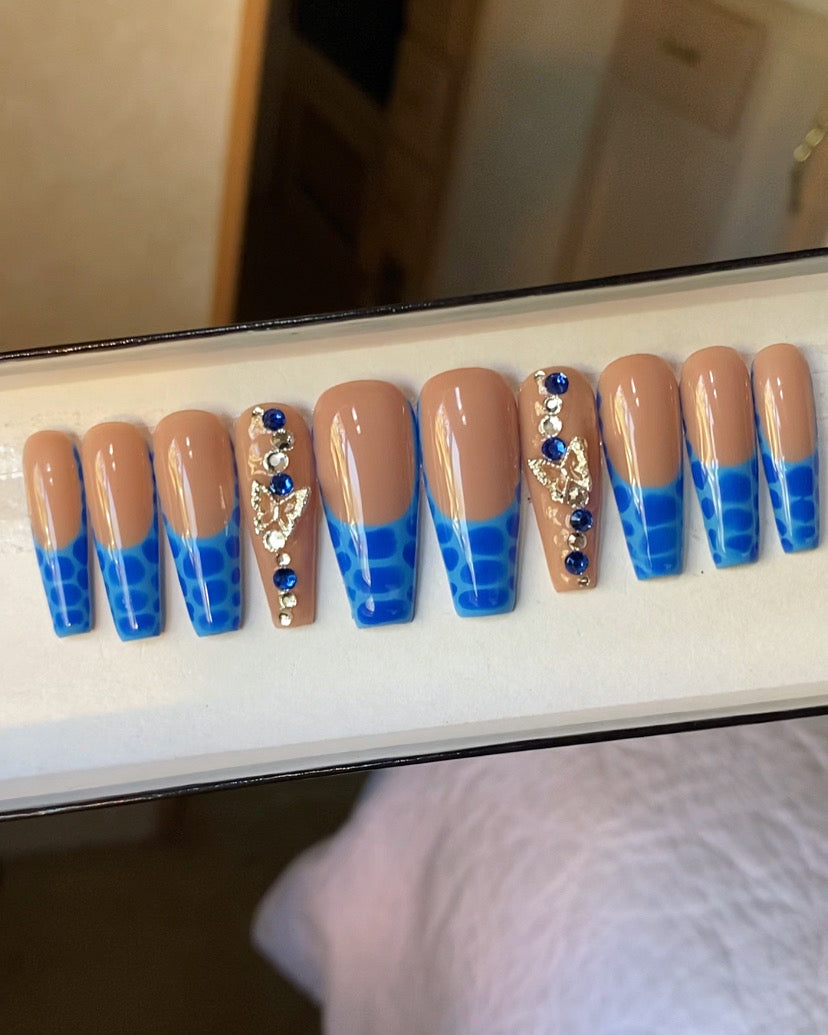 A set of 10 press on nails. Each order of a  press on nail set comes with instructions on how to apply the press on nails as well as an option to purchase a nail glue care pack, a sticky tab care pack, or none. I do have an option to purchase and upgraded nail care pack as well. (THIS IS HIGHLY RECOMMENDED) Nails are reusable with the proper care. CUSTOMIZATION IS ALWAYS POSSIBLE.