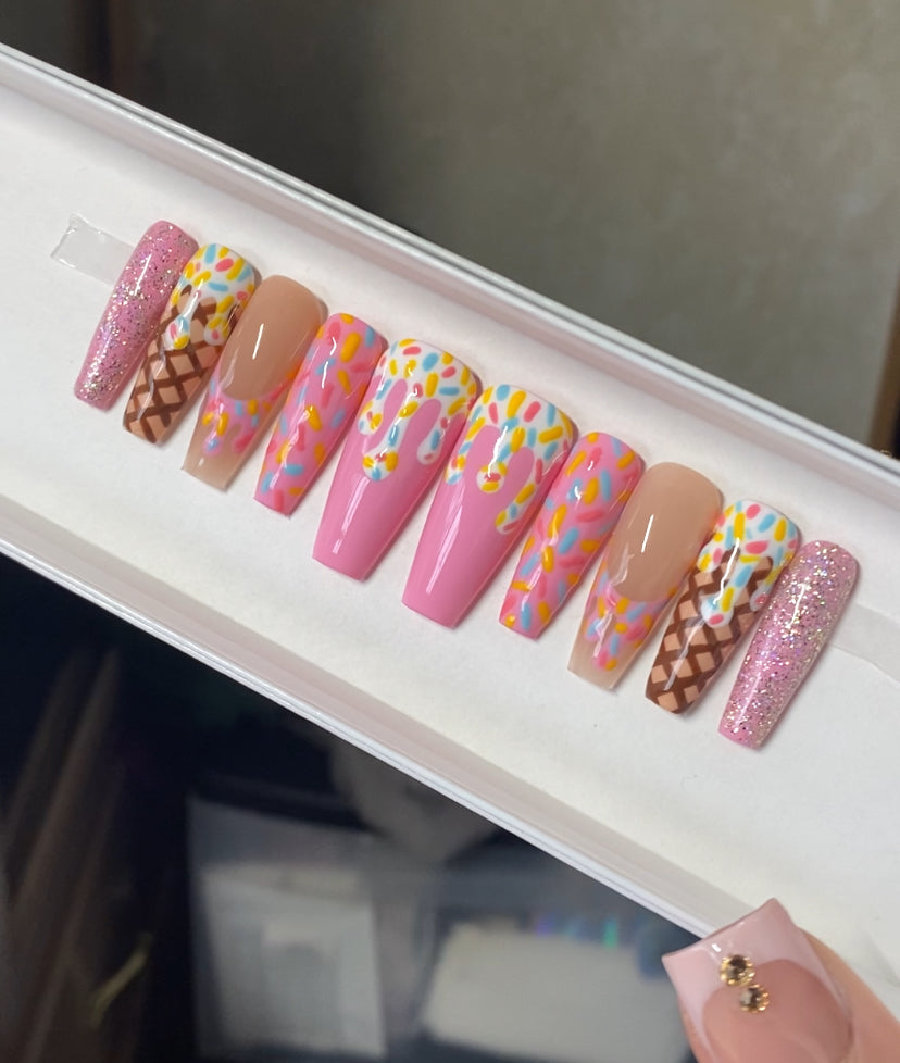 A set of 10 press on nails. Each order of a press on nail set comes with instructions on how to apply the press on nails as well as an option to purchase a nail glue care pack, a sticky tab care pack, or none. I do have an option to purchase and upgraded nail care pack as well. (THIS IS HIGHLY RECOMMENDED) Nails are reusable with the proper care. CUSTOMIZATION IS ALWAYS POSSIBLE.