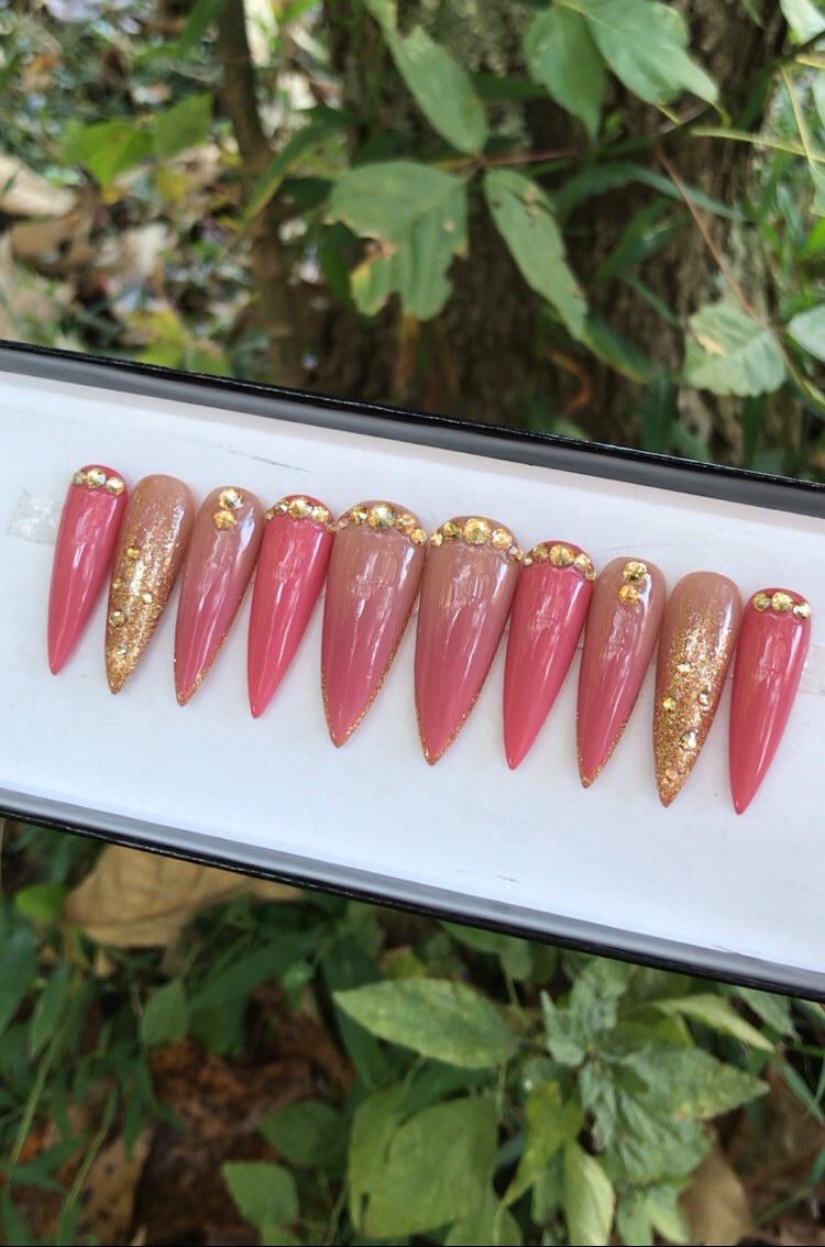 A set of 10 press on nails. Each order of a press on nail set comes with instructions on how to apply the press on nails as well as an option to purchase a nail glue care pack, a sticky tab care pack, or none. I do have an option to purchase and upgraded nail care pack as well. (THIS IS HIGHLY RECOMMENDED) Nails are reusable with the proper care. CUSTOMIZATION IS ALWAYS POSSIBLE.