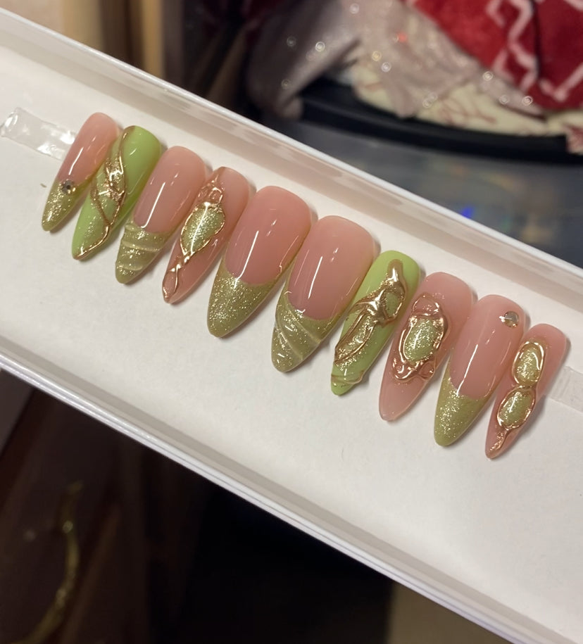 A set of 10 press on nails. Each order of a press on nail set comes with instructions on how to apply the press on nails as well as an option to purchase a nail glue care pack, a sticky tab care pack, or none. I do have an option to purchase and upgraded nail care pack as well. (THIS IS HIGHLY RECOMMENDED) Nails are reusable with the proper care. CUSTOMIZATION IS ALWAYS POSSIBLE.