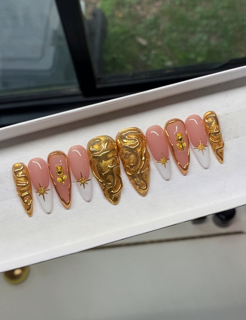 A set of 10 press on nails. Each order of a press on nail set comes with instructions on how to apply the press on nails as well as an option to purchase a nail glue care pack, a sticky tab care pack, or none. I do have an option to purchase and upgraded nail care pack as well. (THIS IS HIGHLY RECOMMENDED) Nails are reusable with the proper care. CUSTOMIZATION IS ALWAYS POSSIBLE.