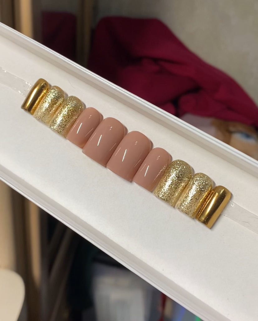 A set of 10 press on nails. Each order of a press on nail set comes with instructions on how to apply the press on nails as well as an option to purchase a nail glue care pack, a sticky tab care pack, or none. I do have an option to purchase and upgraded nail care pack as well. (THIS IS HIGHLY RECOMMENDED) Nails are reusable with the proper care. CUSTOMIZATION IS ALWAYS POSSIBLE.