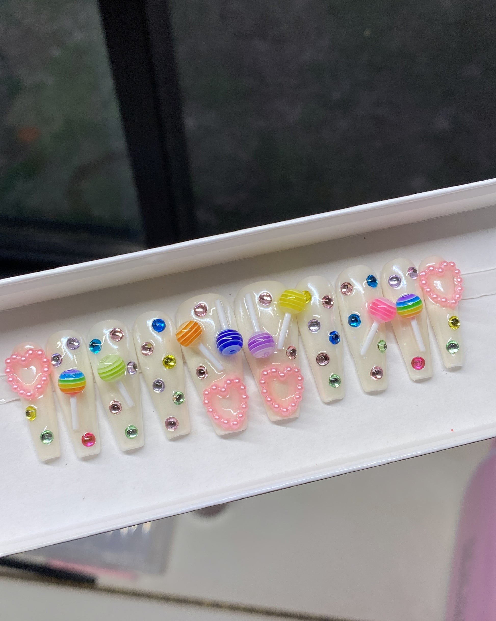 A set of 10 press on nails. Each order of a press on nail set comes with instructions on how to apply the press on nails as well as an option to purchase a nail glue care pack, a sticky tab care pack, or none. I do have an option to purchase and upgraded nail care pack as well. (THIS IS HIGHLY RECOMMENDED) Nails are reusable with the proper care. CUSTOMIZATION IS ALWAYS POSSIBLE.