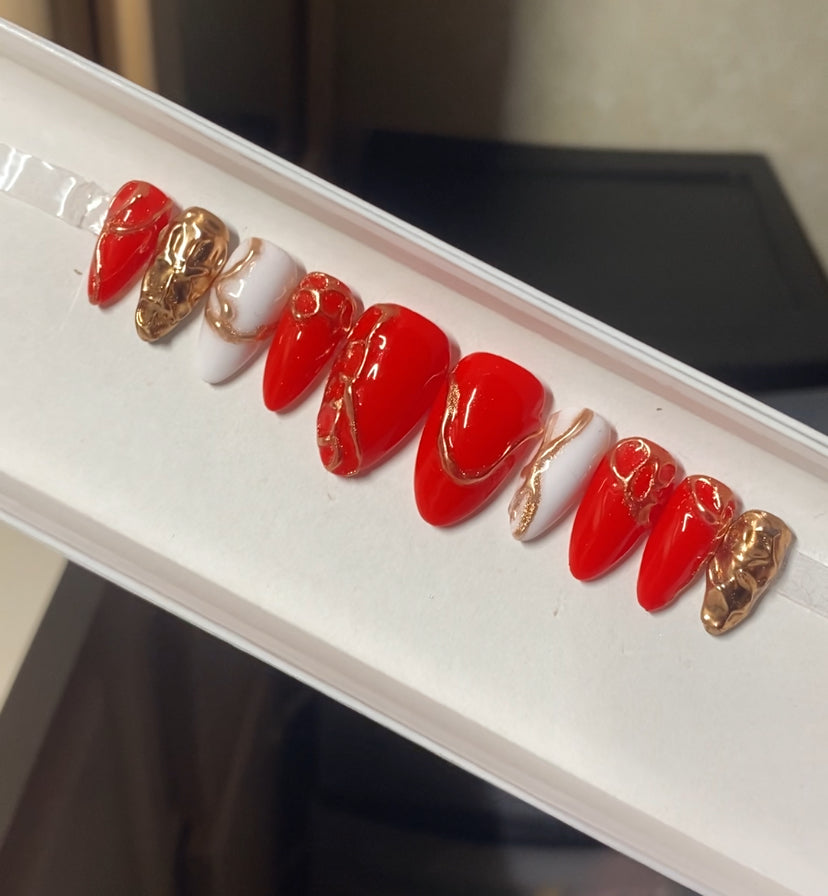 A set of 10 press on nails. Each order of a press on nail set comes with instructions on how to apply the press on nails as well as an option to purchase a nail glue care pack, a sticky tab care pack, or none. I do have an option to purchase and upgraded nail care pack as well. (THIS IS HIGHLY RECOMMENDED) Nails are reusable with the proper care. CUSTOMIZATION IS ALWAYS POSSIBLE.