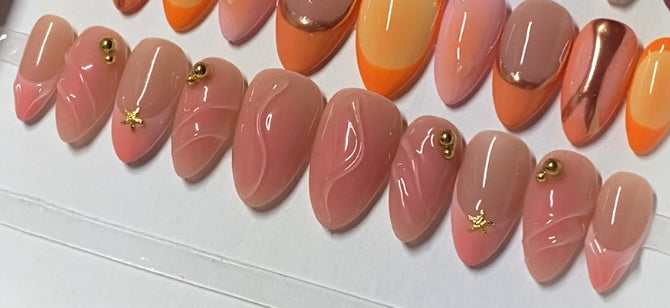 A set of 10 press on nails. Each order of a  press on nail set comes with instructions on how to apply the press on nails as well as an option to purchase a nail glue care pack, a sticky tab care pack, or none. I do have an option to purchase and upgraded nail care pack as well. (THIS IS HIGHLY RECOMMENDED) Nails are reusable with the proper care. CUSTOMIZATION IS ALWAYS POSSIBLE.