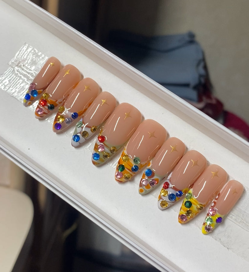 A set of 10 press on nails. Each order of a press on nail set comes with instructions on how to apply the press on nails as well as an option to purchase a nail glue care pack, a sticky tab care pack, or none. I do have an option to purchase and upgraded nail care pack as well. (THIS IS HIGHLY RECOMMENDED) Nails are reusable with the proper care. CUSTOMIZATION IS ALWAYS POSSIBLE.