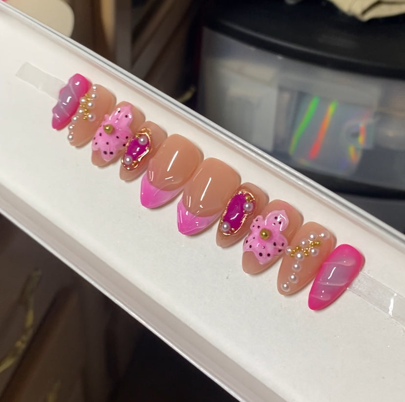 A set of 10 press on nails. Each order of a press on nail set comes with instructions on how to apply the press on nails as well as an option to purchase a nail glue care pack, a sticky tab care pack, or none. I do have an option to purchase and upgraded nail care pack as well. (THIS IS HIGHLY RECOMMENDED) Nails are reusable with the proper care. CUSTOMIZATION IS ALWAYS POSSIBLE.