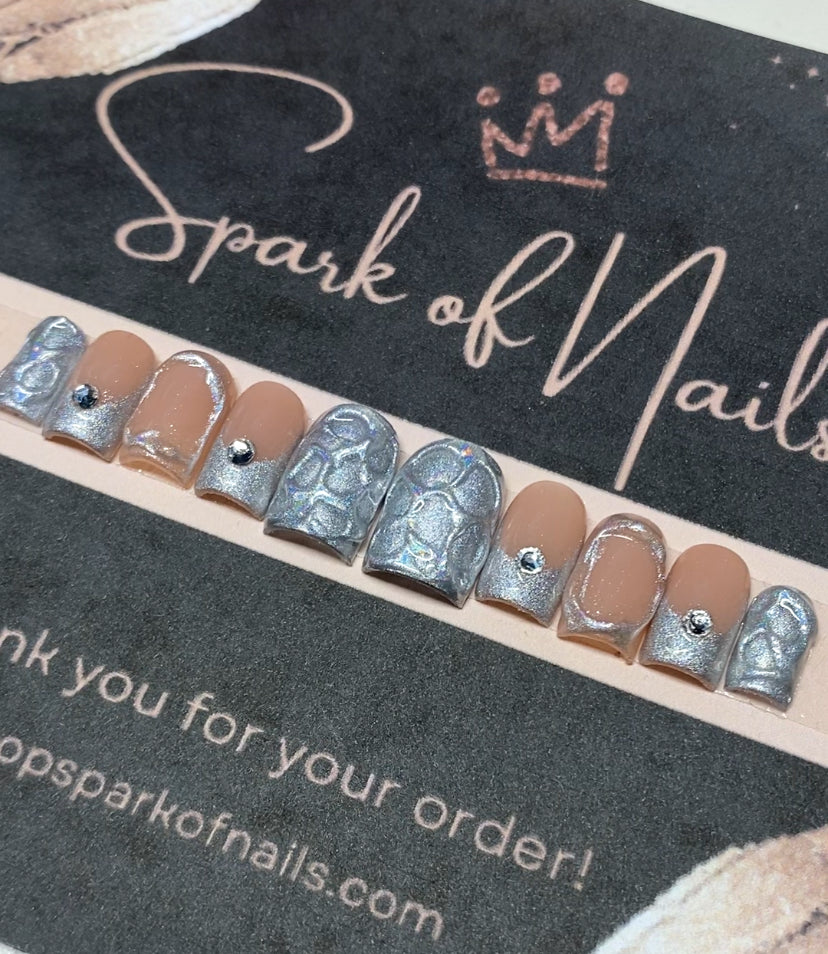 A set of 10 press on nails. Each order of a press on nail set comes with instructions on how to apply the press on nails as well as an option to purchase a nail glue care pack, a sticky tab care pack, or none. I do have an option to purchase and upgraded nail care pack as well. (THIS IS HIGHLY RECOMMENDED) Nails are reusable with the proper care. CUSTOMIZATION IS ALWAYS POSSIBLE.