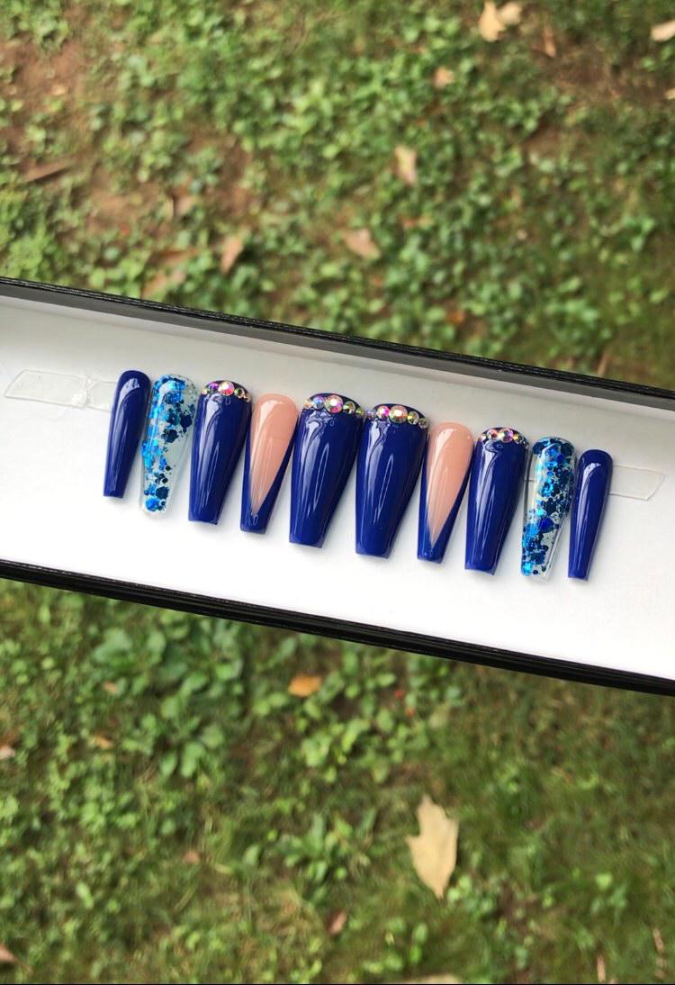 A set of 10 press on nails. Each order of a press on nail set comes with instructions on how to apply the press on nails as well as an option to purchase a nail glue care pack, a sticky tab care pack, or none. I do have an option to purchase and upgraded nail care pack as well. (THIS IS HIGHLY RECOMMENDED) Nails are reusable with the proper care. CUSTOMIZATION IS ALWAYS POSSIBLE.