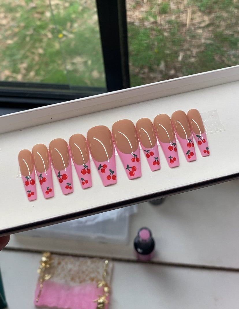 A set of 10 press on nails. Each order of a  press on nail set comes with instructions on how to apply the press on nails as well as an option to purchase a nail glue care pack, a sticky tab care pack, or none. I do have an option to purchase and upgraded nail care pack as well. (THIS IS HIGHLY RECOMMENDED) Nails are reusable with the proper care. CUSTOMIZATION IS ALWAYS POSSIBLE.