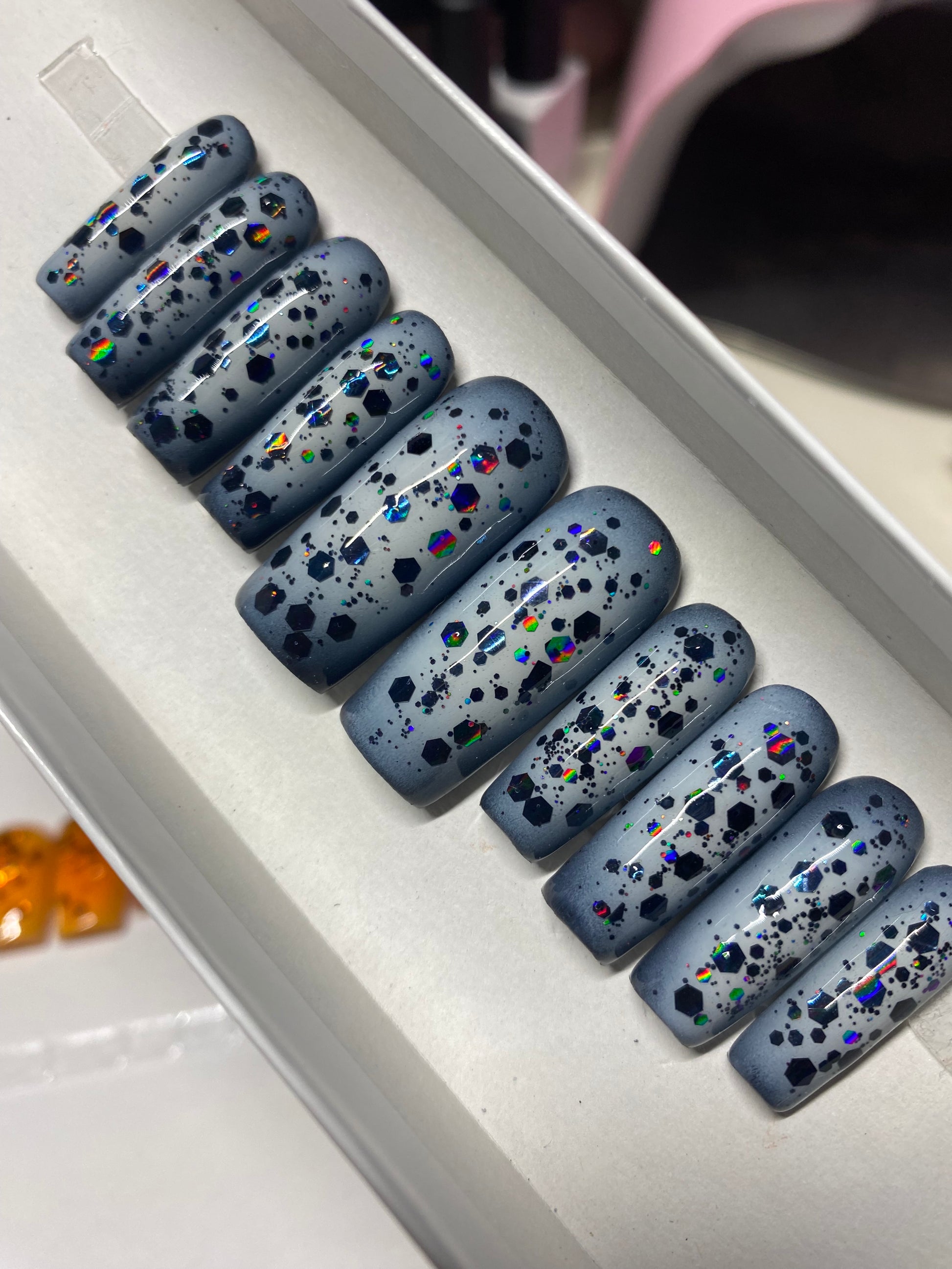 A set of 10 press on nails. Each order of a  press on nail set comes with instructions on how to apply the press on nails as well as an option to purchase a nail glue care pack, a sticky tab care pack, or none. I do have an option to purchase and upgraded nail care pack as well. (THIS IS HIGHLY RECOMMENDED) Nails are reusable with the proper care. CUSTOMIZATION IS ALWAYS POSSIBLE.