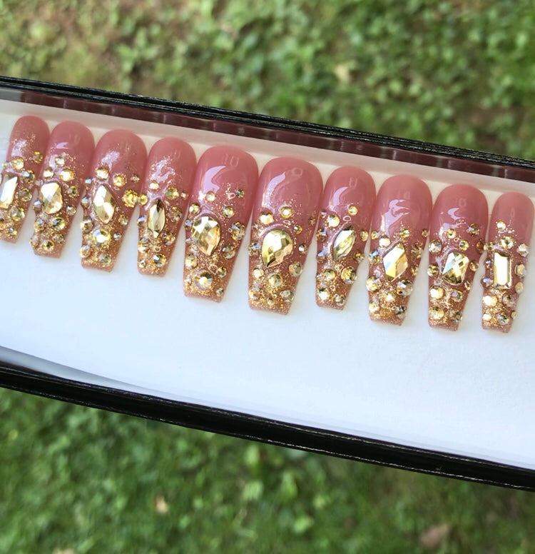 A set of 10 press on nails. Each order of a press on nail set comes with instructions on how to apply the press on nails as well as an option to purchase a nail glue care pack, a sticky tab care pack, or none. I do have an option to purchase and upgraded nail care pack as well. (THIS IS HIGHLY RECOMMENDED) Nails are reusable with the proper care. CUSTOMIZATION IS ALWAYS POSSIBLE.
