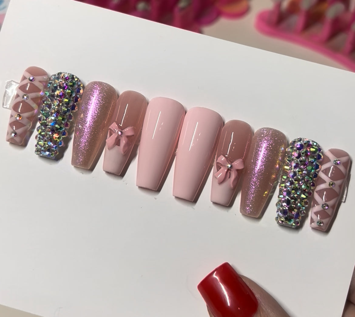 A set of 10 press on nails. Each order of a  press on nail set comes with instructions on how to apply the press on nails as well as an option to purchase a nail glue care pack, a sticky tab care pack, or none. I do have an option to purchase and upgraded nail care pack as well. (THIS IS HIGHLY RECOMMENDED) Nails are reusable with the proper care. CUSTOMIZATION IS ALWAYS POSSIBLE.