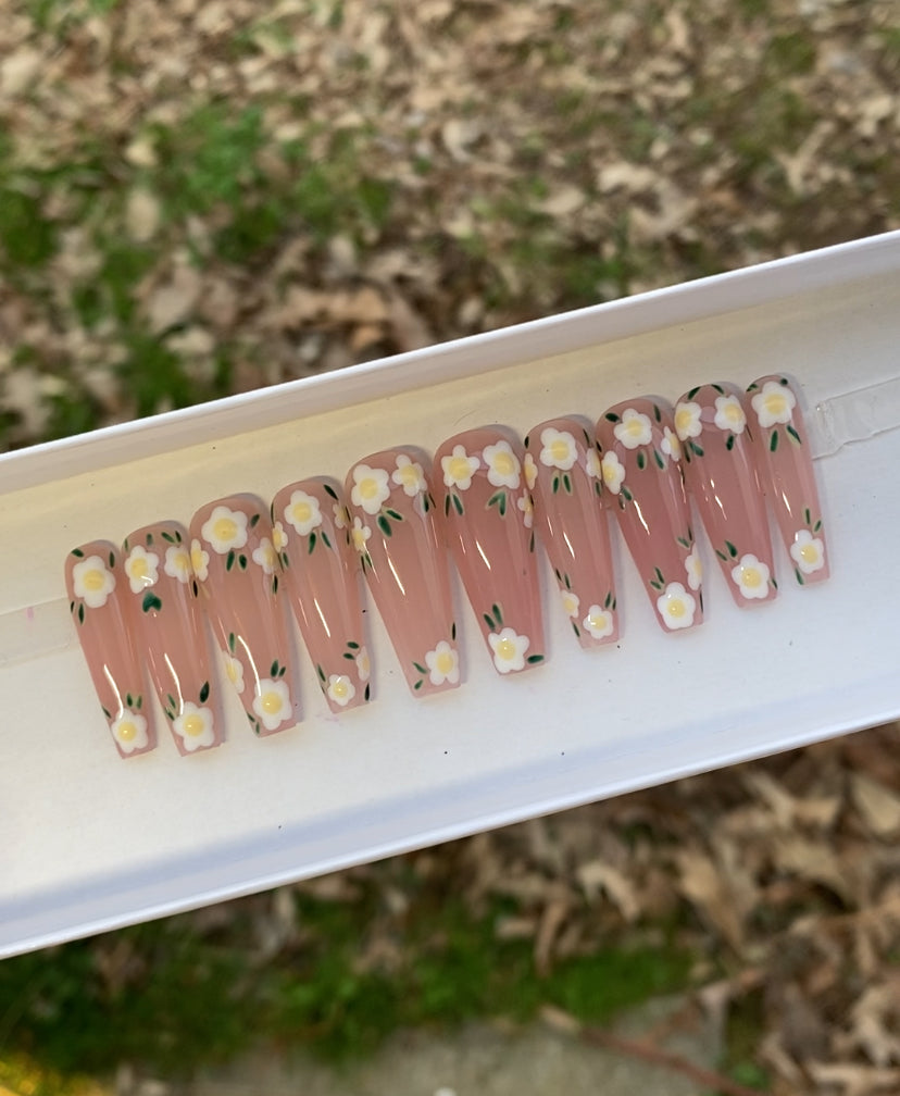 A set of 10 press on nails. Each order of a press on nail set comes with instructions on how to apply the press on nails as well as an option to purchase a nail glue care pack, a sticky tab care pack, or none. I do have an option to purchase and upgraded nail care pack as well. (THIS IS HIGHLY RECOMMENDED) Nails are reusable with the proper care. CUSTOMIZATION IS ALWAYS POSSIBLE.