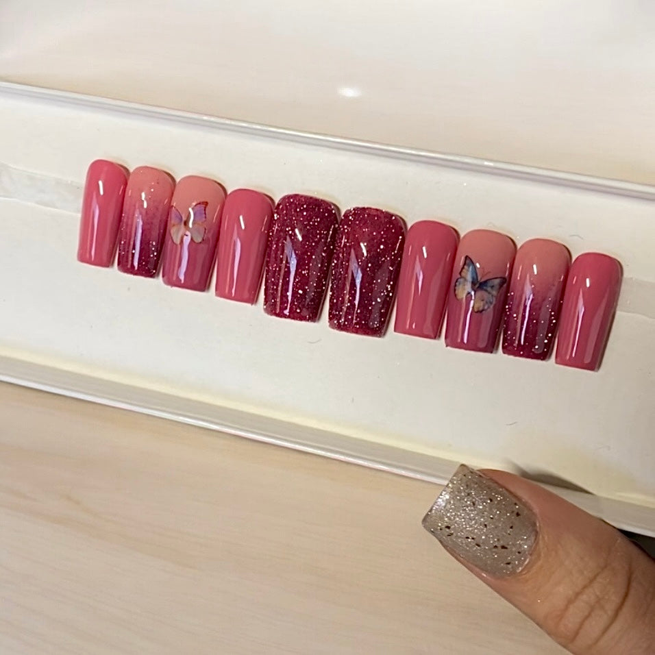 A set of 10 press on nails. Each order of a  press on nail set comes with instructions on how to apply the press on nails as well as an option to purchase a nail glue care pack, a sticky tab care pack, or none. I do have an option to purchase and upgraded nail care pack as well. (THIS IS HIGHLY RECOMMENDED) Nails are reusable with the proper care. CUSTOMIZATION IS ALWAYS POSSIBLE.