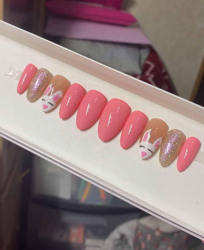 A set of 10 press on nails. Each order of a press on nail set comes with instructions on how to apply the press on nails as well as an option to purchase a nail glue care pack, a sticky tab care pack, or none. I do have an option to purchase and upgraded nail care pack as well. (THIS IS HIGHLY RECOMMENDED) Nails are reusable with the proper care. CUSTOMIZATION IS ALWAYS POSSIBLE.