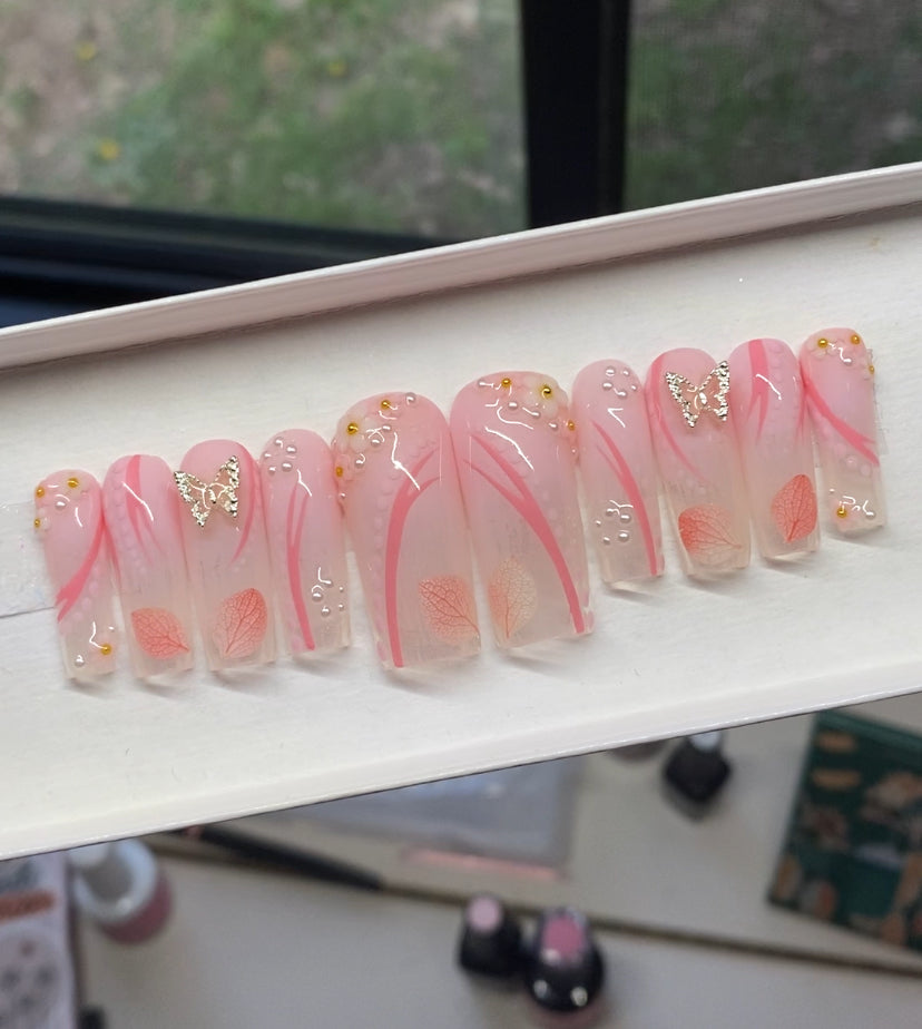 A set of 10 press on nails. Each order of a  press on nail set comes with instructions on how to apply the press on nails as well as an option to purchase a nail glue care pack, a sticky tab care pack, or none. I do have an option to purchase and upgraded nail care pack as well. (THIS IS HIGHLY RECOMMENDED) Nails are reusable with the proper care. CUSTOMIZATION IS ALWAYS POSSIBLE.