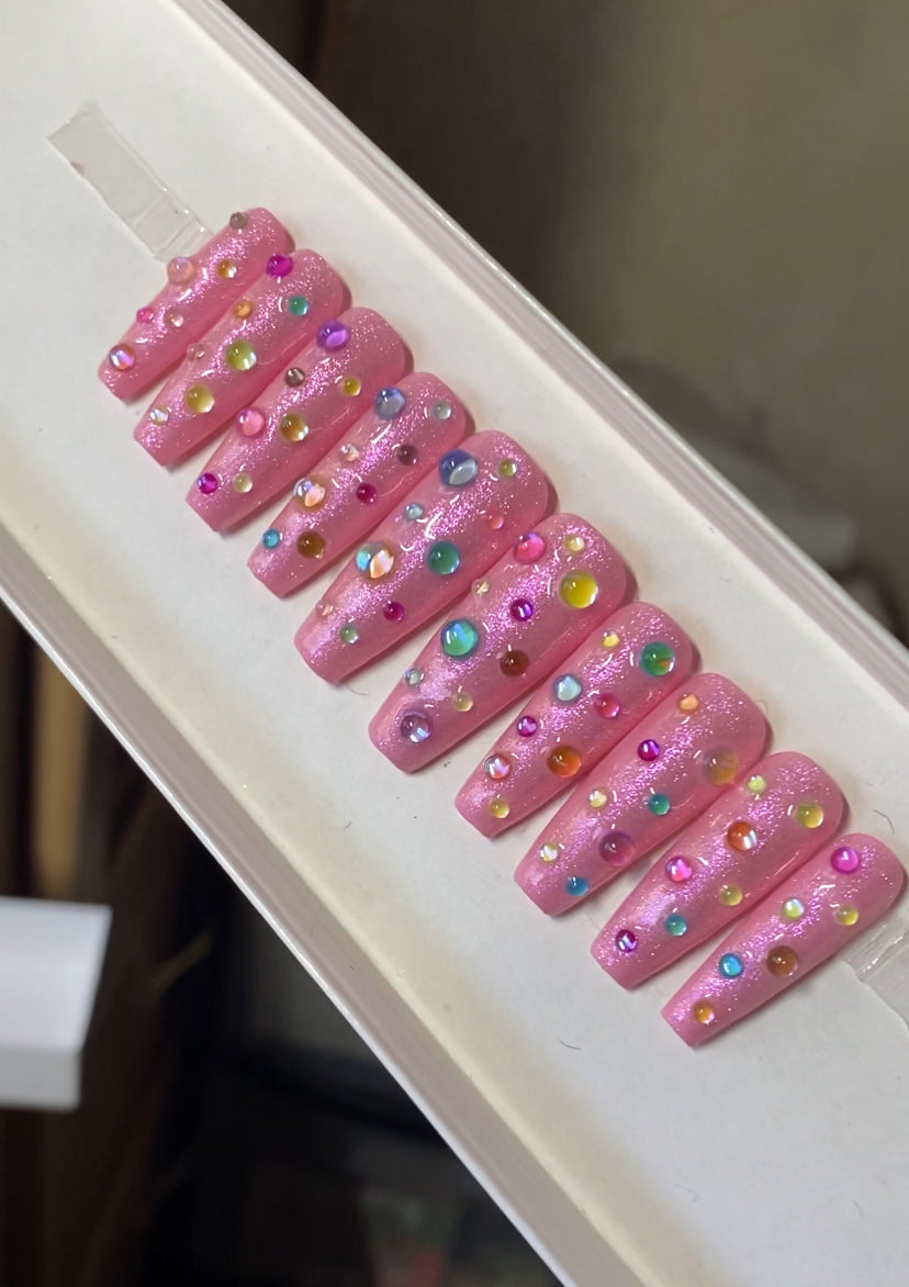A set of 10 press on nails. Each order of a press on nail set comes with instructions on how to apply the press on nails as well as an option to purchase a nail glue care pack, a sticky tab care pack, or none. I do have an option to purchase and upgraded nail care pack as well. (THIS IS HIGHLY RECOMMENDED) Nails are reusable with the proper care. CUSTOMIZATION IS ALWAYS POSSIBLE.