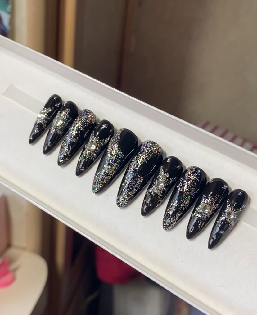 A set of 10 press on nails. Each order of a press on nail set comes with instructions on how to apply the press on nails as well as an option to purchase a nail glue care pack, a sticky tab care pack, or none. I do have an option to purchase and upgraded nail care pack as well. (THIS IS HIGHLY RECOMMENDED) Nails are reusable with the proper care. CUSTOMIZATION IS ALWAYS POSSIBLE.