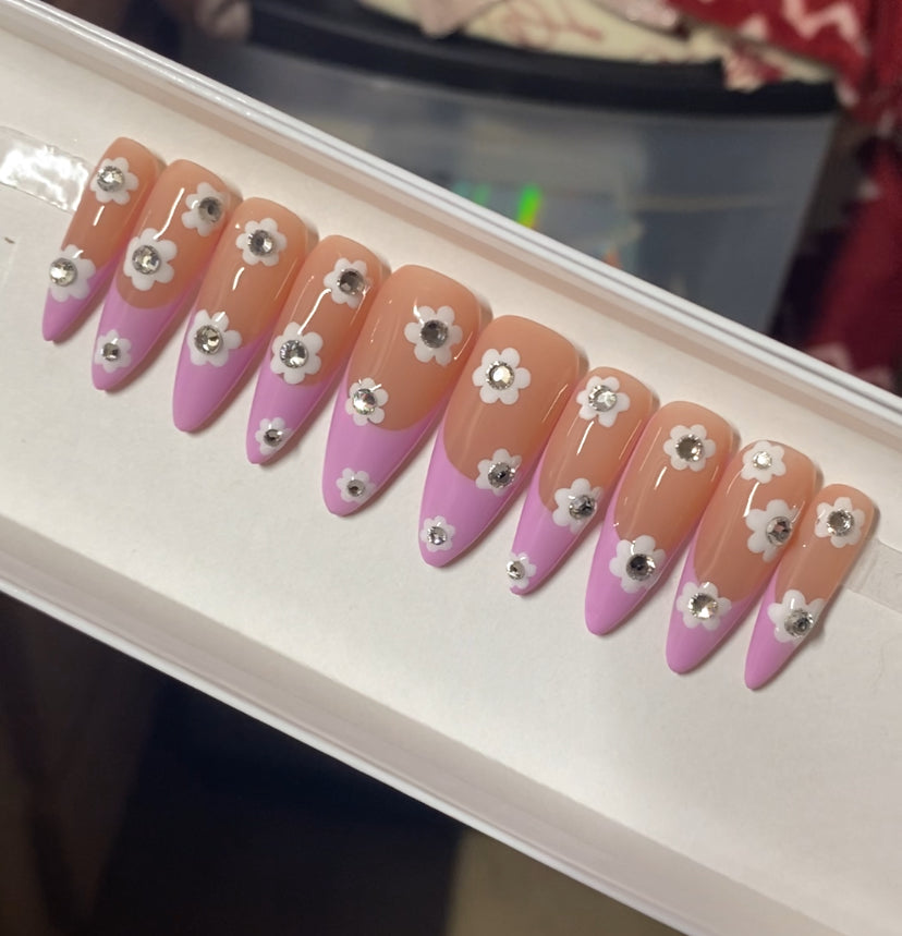 A set of 10 press on nails. Each order of a press on nail set comes with instructions on how to apply the press on nails as well as an option to purchase a nail glue care pack, a sticky tab care pack, or none. I do have an option to purchase and upgraded nail care pack as well. (THIS IS HIGHLY RECOMMENDED) Nails are reusable with the proper care. CUSTOMIZATION IS ALWAYS POSSIBLE.