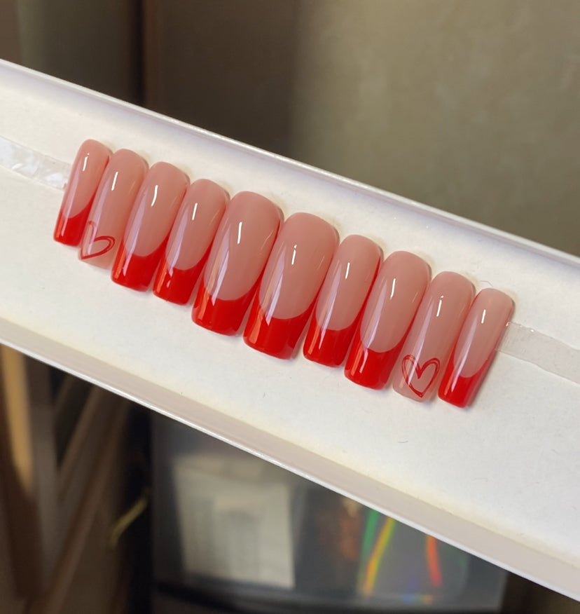 A set of 10 press on nails. Each order of a  press on nail set comes with instructions on how to apply the press on nails as well as an option to purchase a nail glue care pack, a sticky tab care pack, or none. I do have an option to purchase and upgraded nail care pack as well. (THIS IS HIGHLY RECOMMENDED) Nails are reusable with the proper care. CUSTOMIZATION IS ALWAYS POSSIBLE.