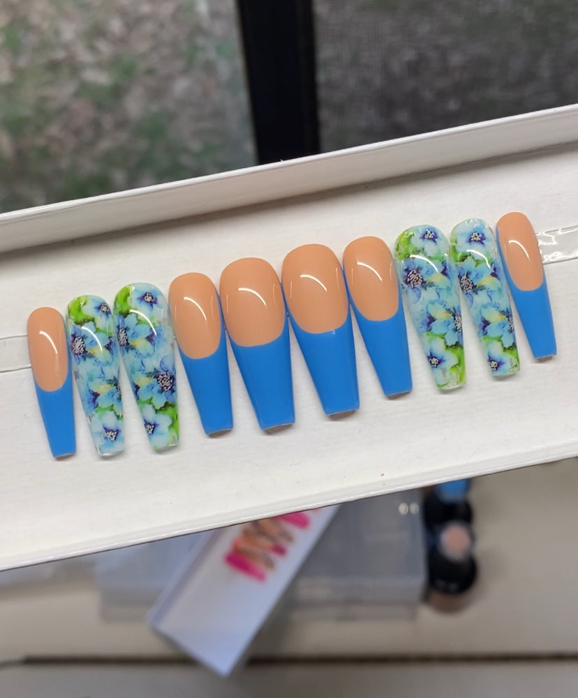 A set of 10 press on nails. Each order of a press on nail set comes with instructions on how to apply the press on nails as well as an option to purchase a nail glue care pack, a sticky tab care pack, or none. I do have an option to purchase and upgraded nail care pack as well. (THIS IS HIGHLY RECOMMENDED) Nails are reusable with the proper care. CUSTOMIZATION IS ALWAYS POSSIBLE.