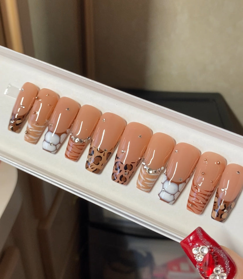 A set of 10 press on nails. Each order of a press on nail set comes with instructions on how to apply the press on nails as well as an option to purchase a nail glue care pack, a sticky tab care pack, or none. I do have an option to purchase and upgraded nail care pack as well. (THIS IS HIGHLY RECOMMENDED) Nails are reusable with the proper care. CUSTOMIZATION IS ALWAYS POSSIBLE.