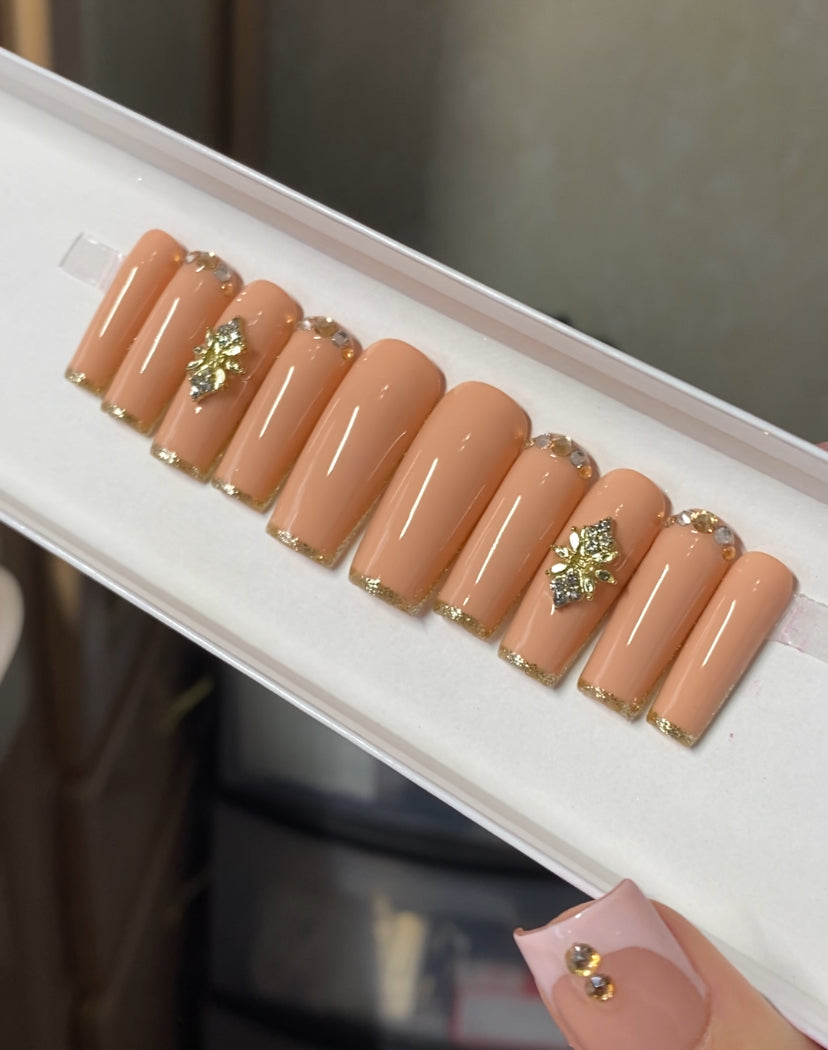 A set of 10 press on nails. Each order of a press on nail set comes with instructions on how to apply the press on nails as well as an option to purchase a nail glue care pack, a sticky tab care pack, or none. I do have an option to purchase and upgraded nail care pack as well. (THIS IS HIGHLY RECOMMENDED) Nails are reusable with the proper care. CUSTOMIZATION IS ALWAYS POSSIBLE.