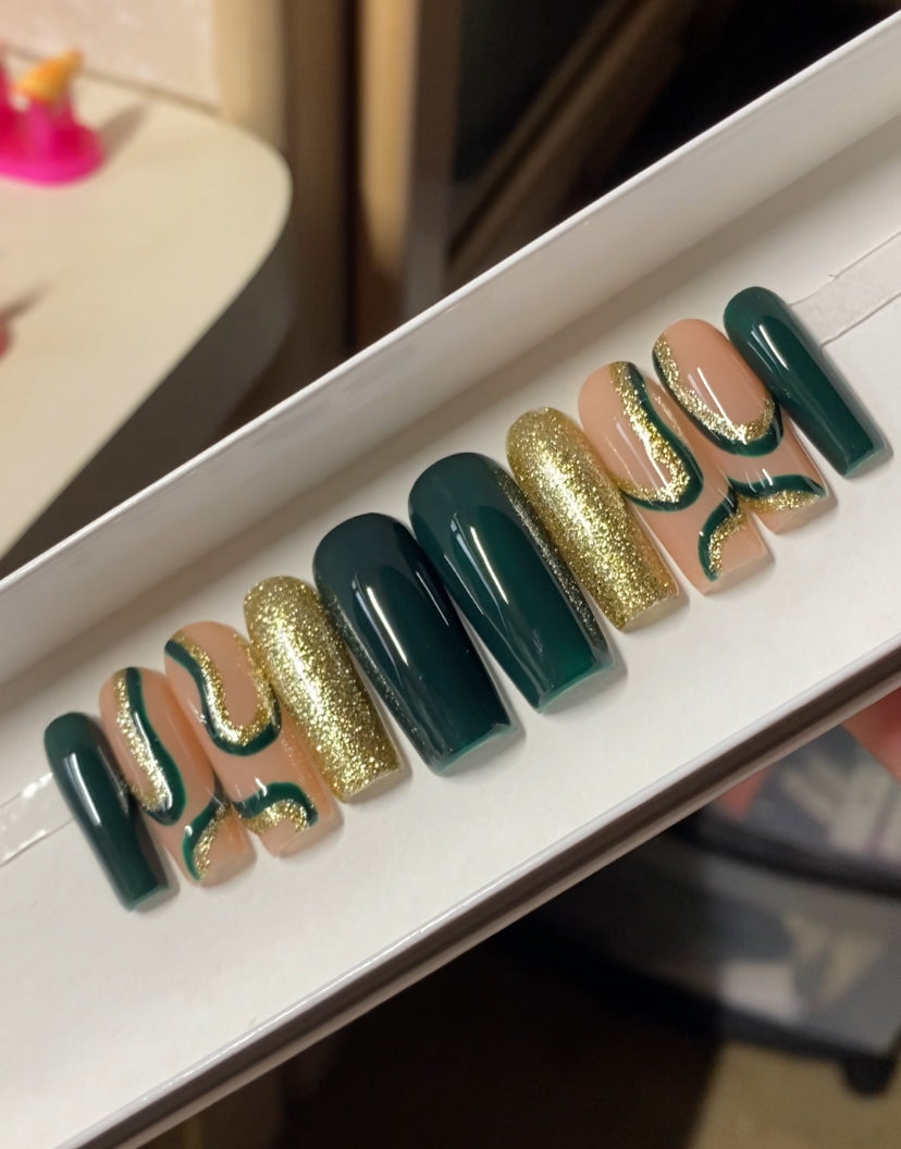 A set of 10 press on nails. Each order of a  press on nail set comes with instructions on how to apply the press on nails as well as an option to purchase a nail glue care pack, a sticky tab care pack, or none. I do have an option to purchase and upgraded nail care pack as well. (THIS IS HIGHLY RECOMMENDED) Nails are reusable with the proper care. CUSTOMIZATION IS ALWAYS POSSIBLE.