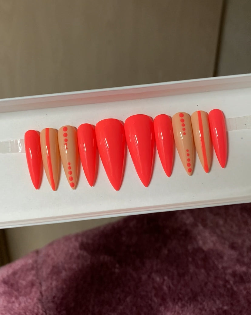 A set of 10 press on nails. Each order of a press on nail set comes with instructions on how to apply the press on nails as well as an option to purchase a nail glue care pack, a sticky tab care pack, or none. I do have an option to purchase and upgraded nail care pack as well. (THIS IS HIGHLY RECOMMENDED) Nails are reusable with the proper care. CUSTOMIZATION IS ALWAYS POSSIBLE.