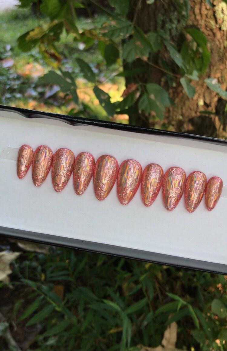 A set of 10 press on nails. Each order of a  press on nail set comes with instructions on how to apply the press on nails as well as an option to purchase a nail glue care pack, a sticky tab care pack, or none. I do have an option to purchase and upgraded nail care pack as well. (THIS IS HIGHLY RECOMMENDED) Nails are reusable with the proper care. CUSTOMIZATION IS ALWAYS POSSIBLE.