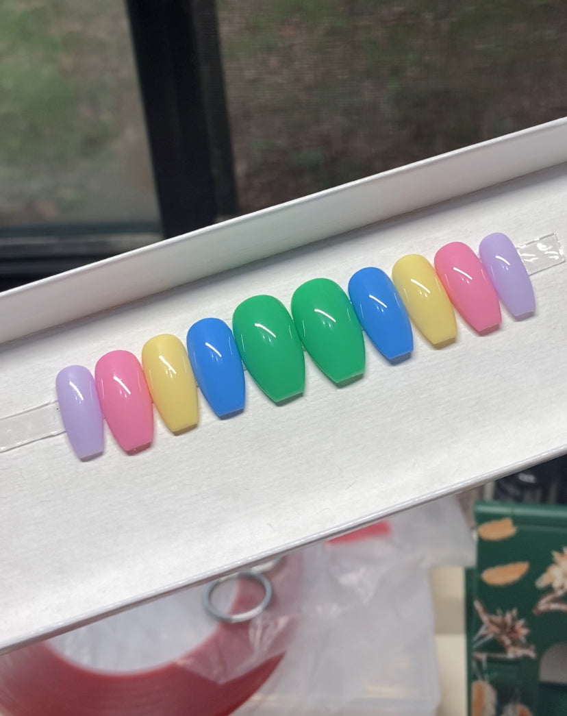 A set of 10 press on nails. Each order of a press on nail set comes with instructions on how to apply the press on nails as well as an option to purchase a nail glue care pack, a sticky tab care pack, or none. I do have an option to purchase and upgraded nail care pack as well. (THIS IS HIGHLY RECOMMENDED) Nails are reusable with the proper care. CUSTOMIZATION IS ALWAYS POSSIBLE.