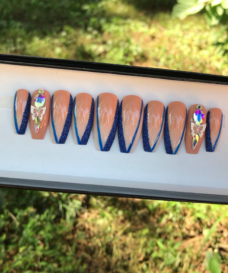 A set of 10 press on nails. Each order of a press on nail set comes with instructions on how to apply the press on nails as well as an option to purchase a nail glue care pack, a sticky tab care pack, or none. I do have an option to purchase and upgraded nail care pack as well. (THIS IS HIGHLY RECOMMENDED) Nails are reusable with the proper care. CUSTOMIZATION IS ALWAYS POSSIBLE.
