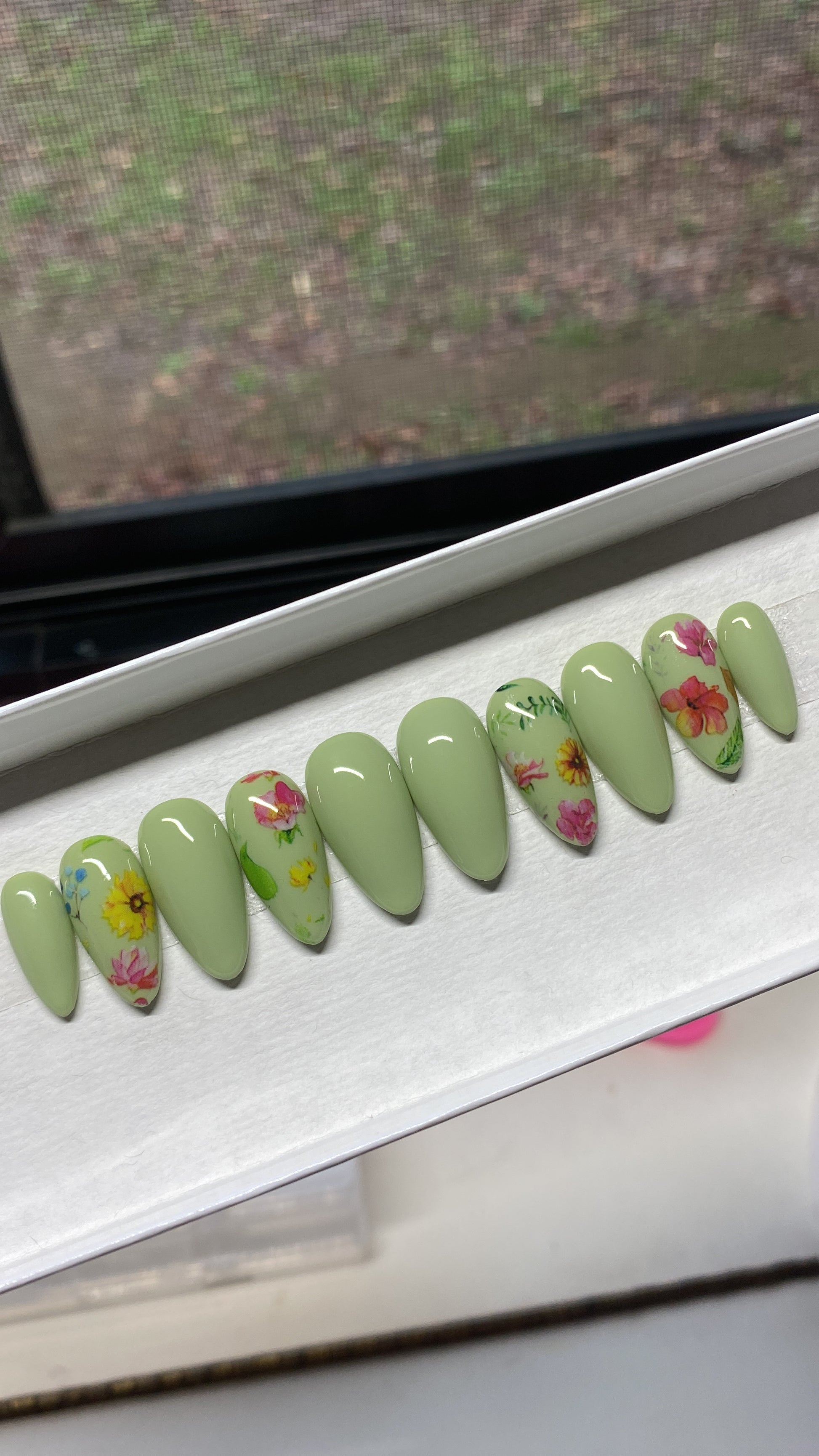 A set of 10 press on nails. Each order of a  press on nail set comes with instructions on how to apply the press on nails as well as an option to purchase a nail glue care pack, a sticky tab care pack, or none. I do have an option to purchase and upgraded nail care pack as well. (THIS IS HIGHLY RECOMMENDED) Nails are reusable with the proper care. CUSTOMIZATION IS ALWAYS POSSIBLE.