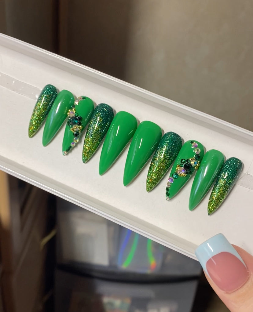 A set of 10 press on nails. Each order of a  press on nail set comes with instructions on how to apply the press on nails as well as an option to purchase a nail glue care pack, a sticky tab care pack, or none. I do have an option to purchase and upgraded nail care pack as well. (THIS IS HIGHLY RECOMMENDED) Nails are reusable with the proper care. CUSTOMIZATION IS ALWAYS POSSIBLE.