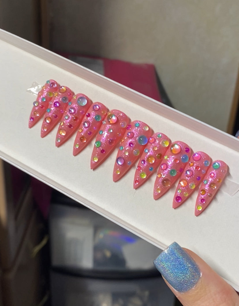 A set of 10 press on nails. Each order of a  press on nail set comes with instructions on how to apply the press on nails as well as an option to purchase a nail glue care pack, a sticky tab care pack, or none. I do have an option to purchase and upgraded nail care pack as well. (THIS IS HIGHLY RECOMMENDED) Nails are reusable with the proper care. CUSTOMIZATION IS ALWAYS POSSIBLE.