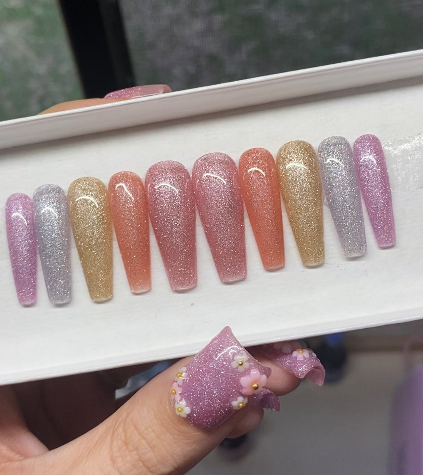 A set of 10 press on nails. Each order of a press on nail set comes with instructions on how to apply the press on nails as well as an option to purchase a nail glue care pack, a sticky tab care pack, or none. I do have an option to purchase and upgraded nail care pack as well. (THIS IS HIGHLY RECOMMENDED) Nails are reusable with the proper care. CUSTOMIZATION IS ALWAYS POSSIBLE.