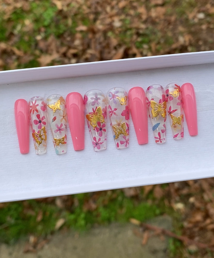 A set of 10 press on nails. Each order of a press on nail set comes with instructions on how to apply the press on nails as well as an option to purchase a nail glue care pack, a sticky tab care pack, or none. I do have an option to purchase and upgraded nail care pack as well. (THIS IS HIGHLY RECOMMENDED) Nails are reusable with the proper care. CUSTOMIZATION IS ALWAYS POSSIBLE.