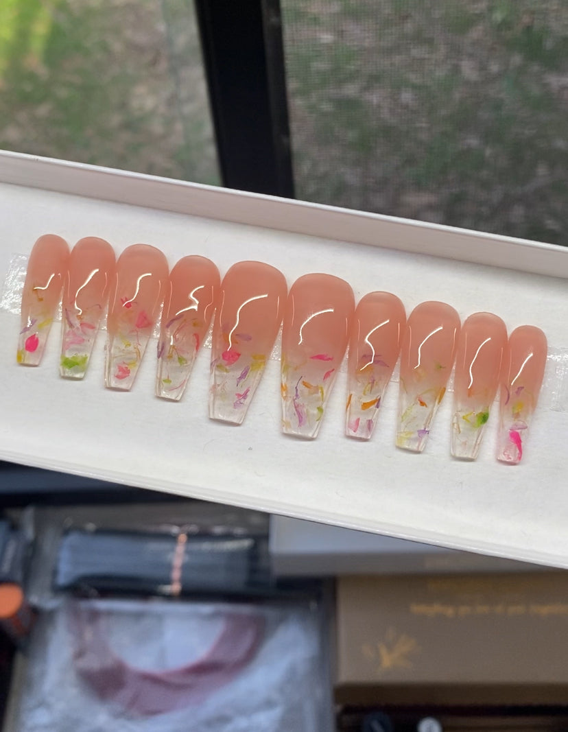 A set of 10 press on nails. Each order of a press on nail set comes with instructions on how to apply the press on nails as well as an option to purchase a nail glue care pack, a sticky tab care pack, or none. I do have an option to purchase and upgraded nail care pack as well. (THIS IS HIGHLY RECOMMENDED) Nails are reusable with the proper care. CUSTOMIZATION IS ALWAYS POSSIBLE.