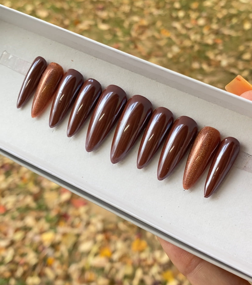 A set of 10 press on nails. Each order of a press on nail set comes with instructions on how to apply the press on nails as well as an option to purchase a nail glue care pack, a sticky tab care pack, or none. I do have an option to purchase and upgraded nail care pack as well. (THIS IS HIGHLY RECOMMENDED) Nails are reusable with the proper care. CUSTOMIZATION IS ALWAYS POSSIBLE.