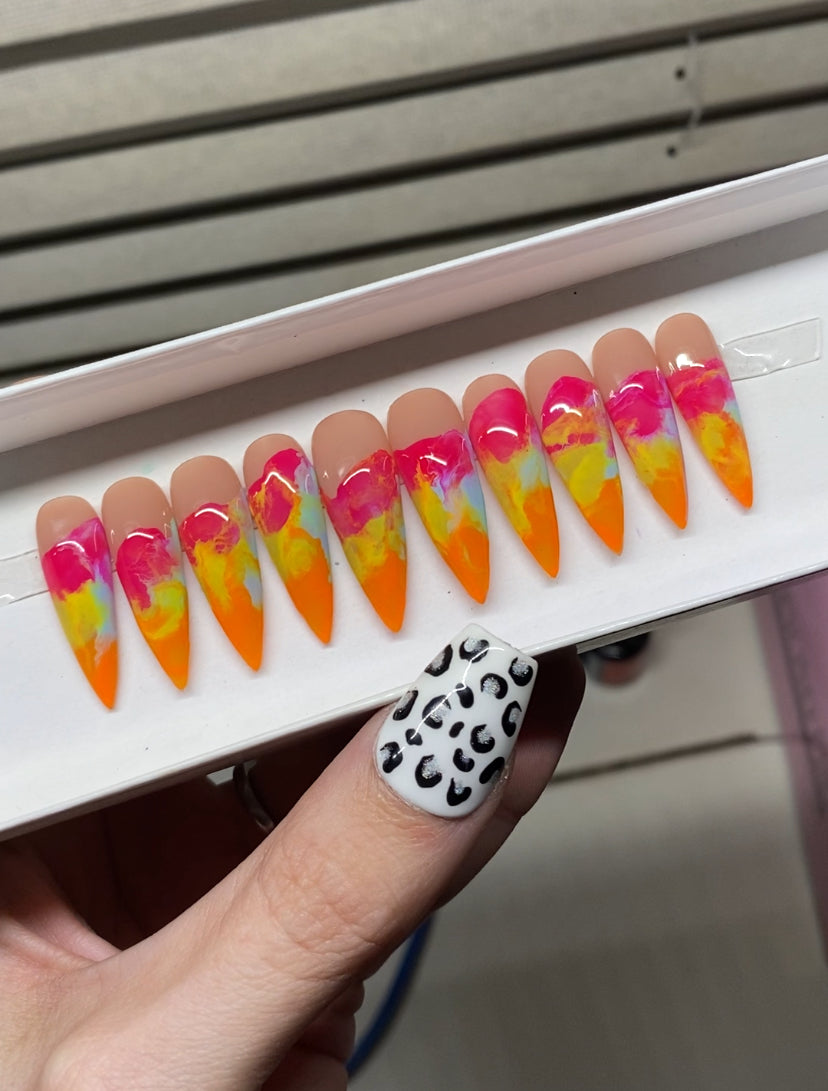 A set of 10 press on nails. Each order of a press on nail set comes with instructions on how to apply the press on nails as well as an option to purchase a nail glue care pack, a sticky tab care pack, or none. I do have an option to purchase and upgraded nail care pack as well. (THIS IS HIGHLY RECOMMENDED) Nails are reusable with the proper care. CUSTOMIZATION IS ALWAYS POSSIBLE.