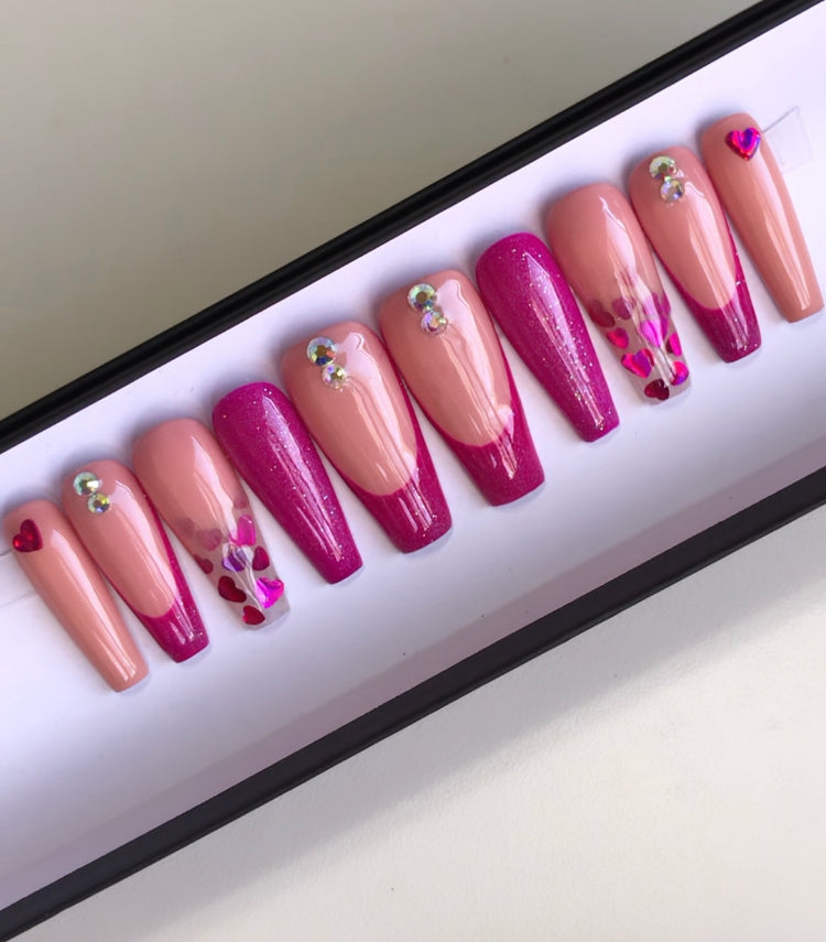 A set of 10 press on nails. Each order of a press on nail set comes with instructions on how to apply the press on nails as well as an option to purchase a nail glue care pack, a sticky tab care pack, or none. I do have an option to purchase and upgraded nail care pack as well. (THIS IS HIGHLY RECOMMENDED) Nails are reusable with the proper care. CUSTOMIZATION IS ALWAYS POSSIBLE.