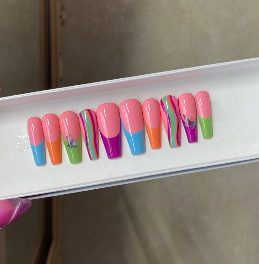 A set of 10 press on nails. Each order of a press on nail set comes with instructions on how to apply the press on nails as well as an option to purchase a nail glue care pack, a sticky tab care pack, or none. I do have an option to purchase and upgraded nail care pack as well. (THIS IS HIGHLY RECOMMENDED) Nails are reusable with the proper care. CUSTOMIZATION IS ALWAYS POSSIBLE.