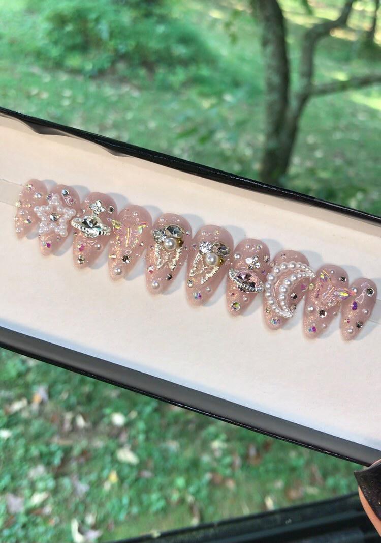 A set of 10 press on nails. Each order of a press on nail set comes with instructions on how to apply the press on nails as well as an option to purchase a nail glue care pack, a sticky tab care pack, or none. I do have an option to purchase and upgraded nail care pack as well. (THIS IS HIGHLY RECOMMENDED) Nails are reusable with the proper care. CUSTOMIZATION IS ALWAYS POSSIBLE.