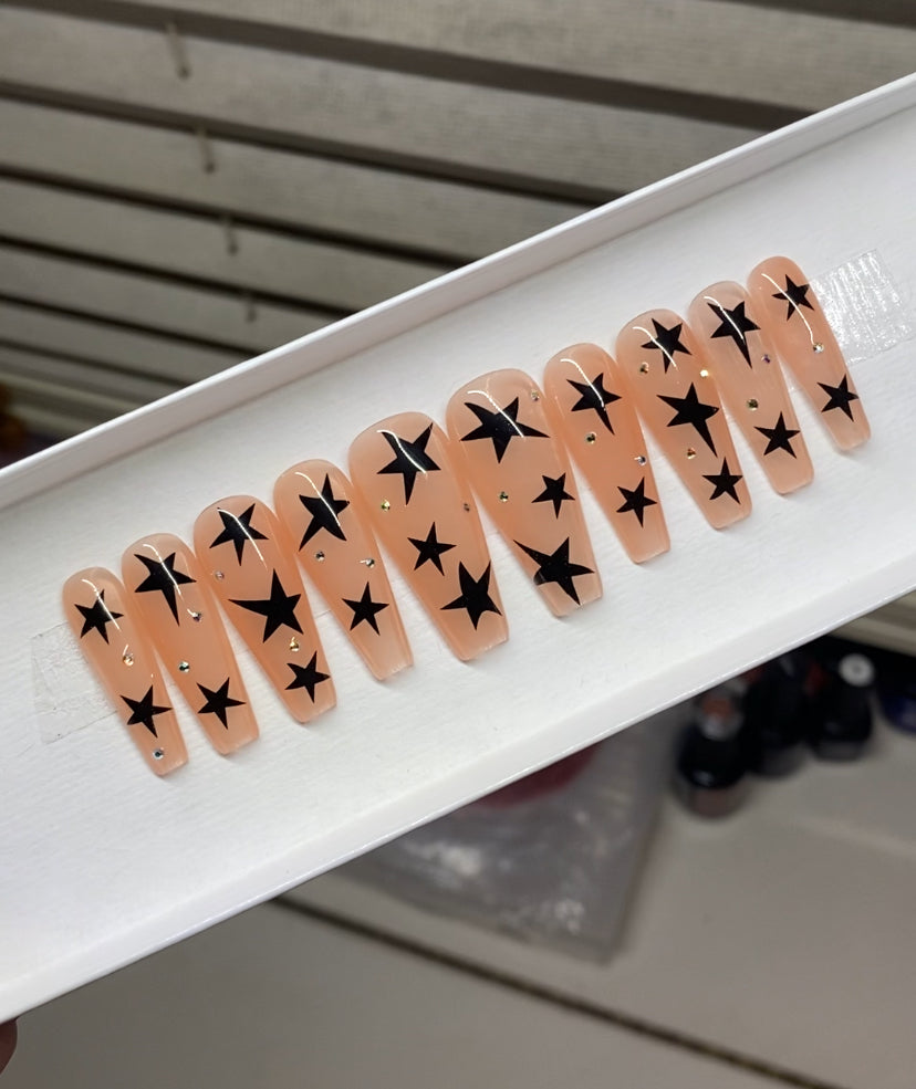 A set of 10 press on nails. Each order of a press on nail set comes with instructions on how to apply the press on nails as well as an option to purchase a nail glue care pack, a sticky tab care pack, or none. I do have an option to purchase and upgraded nail care pack as well. (THIS IS HIGHLY RECOMMENDED) Nails are reusable with the proper care. CUSTOMIZATION IS ALWAYS POSSIBLE.