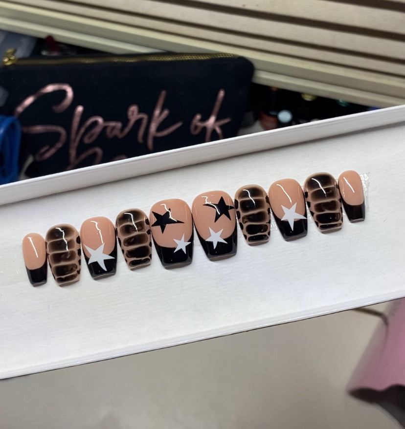 A set of 10 press on nails. Each order of a  press on nail set comes with instructions on how to apply the press on nails as well as an option to purchase a nail glue care pack, a sticky tab care pack, or none. I do have an option to purchase and upgraded nail care pack as well. (THIS IS HIGHLY RECOMMENDED) Nails are reusable with the proper care. CUSTOMIZATION IS ALWAYS POSSIBLE.